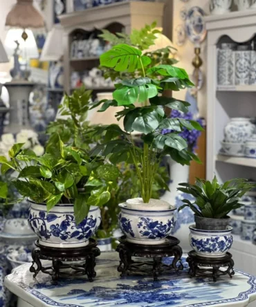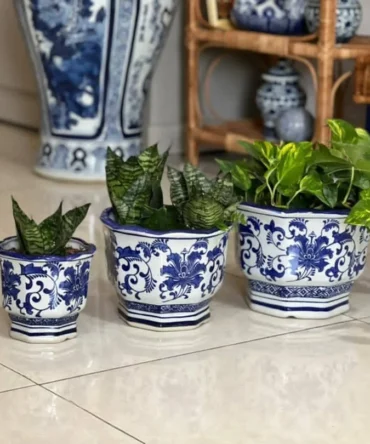 - ست گلدان طبیعی: ست گلدان طبیعی متشکل از سه گلدان یا بانکه چینی قلم آبی در سه سایز مختلف است. نقاشی روی این گلدانها تماما کار دست است و همین موضوع این ست گلدان را به مجموعهای ارزشمند و اثری هنری تبدیل میکند. ارتفاع این گلدانها به ترتیب 30 ،25 و 18 سانتی متر است.