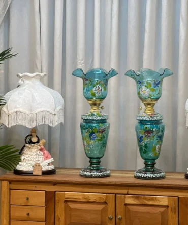 چراغ جفت نفتدان آنتیک سبزآبی تمام نقاشی دست